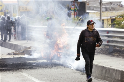 9月16日,在厄瓜多尔首都基多,一名路人经过示威者点燃的路障。