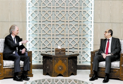 11月24日,在叙利亚大马士革,联合国秘书长叙利亚问题特使裴凯儒(左)与叙利亚外交和侨民事务部长萨巴格会晤。
