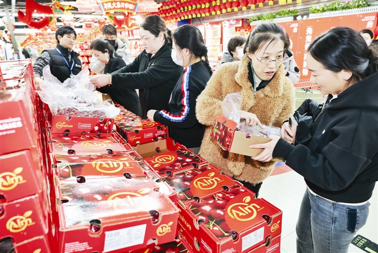 昨日7时,天津港迎来本产季中国北方首船智利进口车厘子。当日13时左右,首批200箱智利车厘子被运到物美超市(华苑店),市民购买尝鲜。 记者 吴迪摄(相关报道见2版)