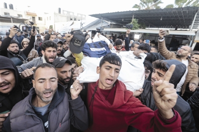 12月26日,在加沙地带中部代尔拜拉赫,当地民众悼念在以军袭击中丧生的记者。巴勒斯坦伊斯兰抵抗运动(哈马斯)媒体办公室26日发表声明说,以色列军队当天轰炸加沙地带中部努赛赖特难民营,造成5名巴勒斯坦记者死亡。 新华社发