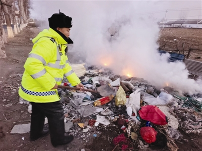 “这会儿风大,我担心燃烧物四处飘散扩大火情,我在这守着,你快点向村委会求援!”执勤中发现路旁杂物起火,交警、辅警立即变身“消防员”。