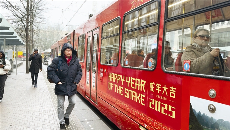 一辆装饰着中国农历新年元素的2025年“欢乐春节”彩绘电车1月21日亮相荷兰海牙,为当地市民带来了浓厚的中国春节喜庆氛围。