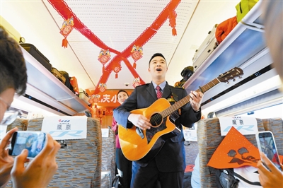 昨天是农历小年,天津西开往香港西九龙的G305次列车上张灯结彩,喜庆的窗花、福字、对联等将车厢装点得喜气洋洋,一场具有浓郁年俗文化韵味的“小年联欢会”正在上演。