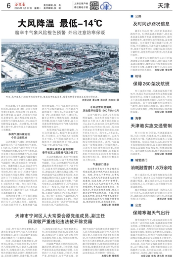 这次寒潮天气过程,带来津城降温降雪大风一系列连贯的天气变化。1月25日,天津市气象台发布今年首个寒潮蓝色预警,受强冷空气影响,26日至28日本市出现寒潮天气,26日凌晨至白天出现降雪,最低气温降幅可达8至10℃,28日早晨中心城区最低气温降至-9℃,其他地区为-15℃到-10℃。寒潮预警之后,26日在冷空气和水汽条件的配合之下,津城迎来今冬初雪,昨日9时10分,天津市气象台发布陆地大风蓝色预警,预报天津地区昨日下午有西北风4-5级阵风7-8级,夜间到明天白天将加强到西北风5-6级阵风8-9级。昨日白天开始,西北风逐渐加大,昨夜至今天本市还有西北风5-6级阵风可达8-9级,28日逐渐减弱至2-3级。