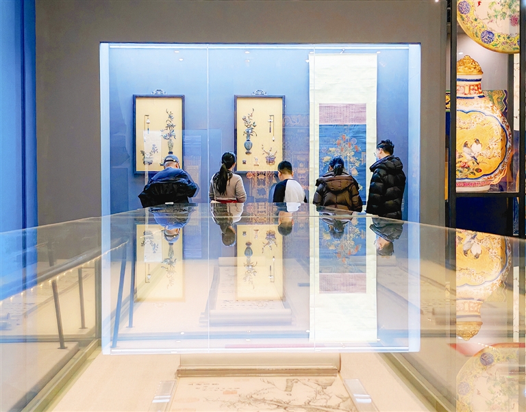 该展以天津博物馆馆藏为依托,联合首都博物馆、河北博物院,涵盖瓷器、玉器、漆器、玺印、书画、缂丝、铜器、古籍等三地馆藏文物精品共计200余件,以“遗珍源流”“锦衣玉食”“岁时宫俗”“宫廷雅致”四个部分,带领广大观众立体深入地了解宫廷文物背后的流传故事与爱国情怀。摄影 本报记者 曹彤