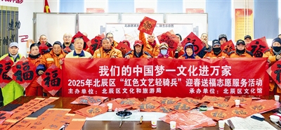 新春之际,北辰区文化馆与区文化遗产保护中心举办了一系列新春文化活动。其中,“我们的中国梦——文化进万家”2025年北辰区“红色文艺轻骑兵”迎春送福志愿服务活动共举办了15场活动,红色文艺轻骑兵们深入各镇街,还前往武警某部等点位,送去红红火火的“新春文化年货”。