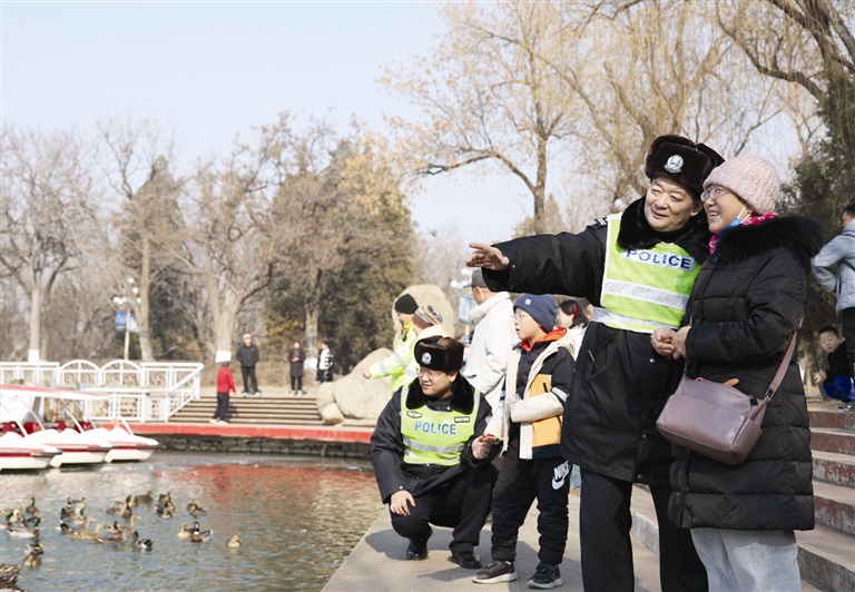 一位带小孩的市民说,春节带孩子出来逛逛公园亲近大自然,孩子刚刚还体验了喂鸭子,感觉很有趣。有民警在一旁巡逻,随时提醒大家注意安全,蓝天救援队的队员也在园里,在这里带孩子游玩感觉很安心。