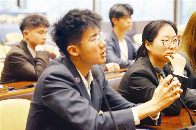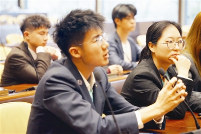 在模拟联合国大会上,天津大学的学生化身各国代表,围绕生物多样性与环境保护、绿色循环经济、能源技术转型、人工智能教育等全球性议题展开激烈讨论。