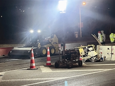每日的施工在凌晨5:00之前必须结束,所以在人员和机械方面加大了单日投入,要求单套设备在2至2.5小时内,完成1000平方米的铣刨作业,尽量将时间留给接下来的摊铺,只有这样才能不影响白天的车辆通行。在完成了这些工序后,后面还要统一对面层进行铺设,保证路面平整畅通。