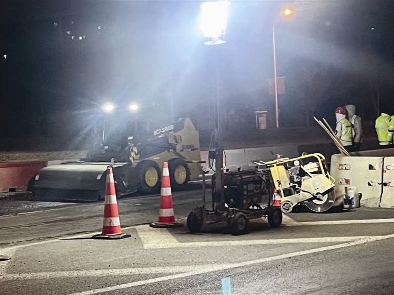 2月17日23:00,行驶在东南快速路上,几座大型立交桥的周边圈出了施工区域,提示避让的设施上都闪着提示灯,现场最显眼的还是树立起来的各种照明灯,让施工区域灯火通明。从河西区方向驶下海津大桥进入辅路,此时一条一条车道已经拉上了防护栏,施工的车辆都竖行排列在了施工区域内。现场的项目技术人员崔冠雄说,按照交管部门审批,为了不影响道路通行,每日的施工时间定在了23:00至转天凌晨5:00,23:00人员设备进场后快速布置防护设施,大约从零点开始正式施工。