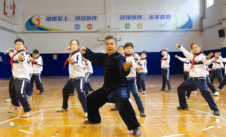 新学期伊始,河西区文化馆邀请陈式太极拳代表性传承人王鸿霖走进上海道小学,为同学们讲解太极拳的基本动作和要领,零距离与学生互动。 本报记者 曹彤 摄