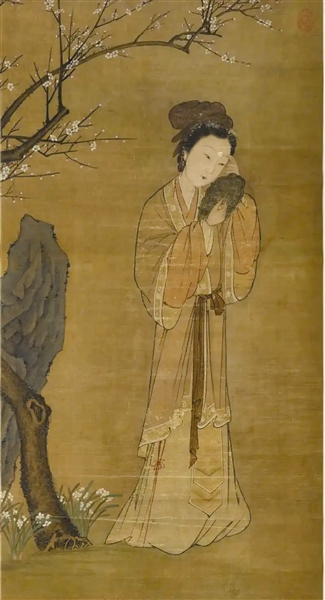 《梅花仕女图》的作者不详,传说为元代作品,但是画中仕女的样貌、体态和服饰等都与明代画家唐寅的画风非常相似。画面溢满才情,格调雅致,画出了梅花清姿以及伊人独立花下的清幽曼妙,或许这就是梅花花神的神韵。