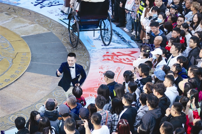 演出当天,金街人群熙攘,《日出》演出开启,人流瞬时向大铜钱广场聚拢。何子雨说:“表演的时候能明显感到大铜钱像一块磁铁,将人们吸引到我们的表演现场。看着观众和我们一起入戏,还有人举起手机拍摄的兴奋,这种零距离的反馈反而让我没那么紧张了……”经过一场演出,沉浸式话剧《日出》在流量和口碑的双重加持下出圈儿,何子雨也完成了属于自己的新突破。