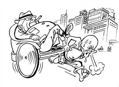 双轮人力车于民国初年出现在天津街头,由于是自外国传入,所以叫洋车。又因是胶皮轱辘,在天律称其“胶皮”。有人家购置若干辆,用来雇人拉车或租车,叫洋车行。也有拉车人自购一辆,靠它养家糊口。干这行费鞋,所以有拉车的干脆赤脚。