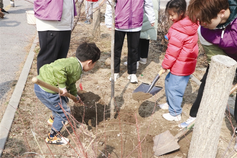 在第47个中国植树节即将来临之际,天津工业大学经济与管理学院的蒲公英志愿者们前往大寺镇博文苑社区,通过“植树护绿+垃圾分类教育”的创新形式,开展“大手牵小手我在天津‘种春天’”植树节主题活动。本报记者 信华 通讯员 陈亚桥 李垚