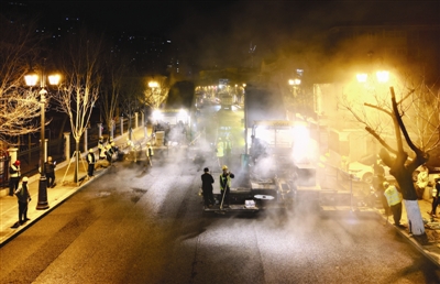 3月26日夜晚的成都道上,施工人员以及各种工程车、沥青运输车,全都在各自的位置上待命。五大道区域与城市的其他地区不同,市民出行比较多,施工开始的时间要比其他区域晚一个多小时,核心路段施工集中在夜间23:00至次日5:00。随着27日零点到来,一辆9路公交车缓缓驶过与桂林路的交口,守候在路口的施工人员随即摆上了隔离设施,摊铺机也开始启动。