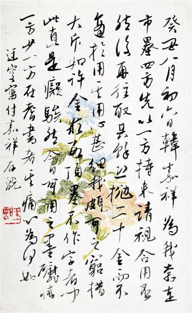 此幅用清朝旧笺,又是乾隆时的墨,纸墨相发十分精到。吴老晚年的作品多用此墨写成。
