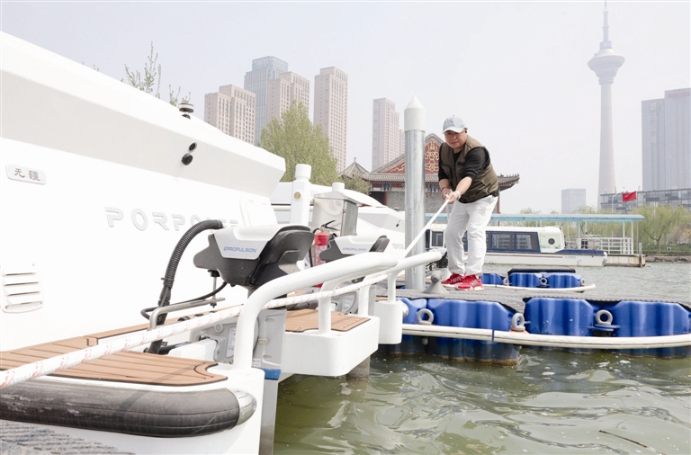 工作人员增加缆绳数量稳固湖面上的游船。 摄影 记者 吴迪
