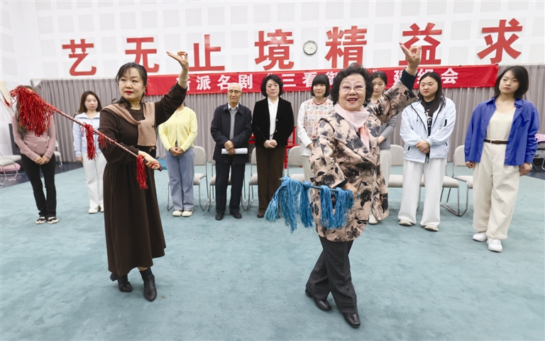 扎实全面的基础,全面的学习,让谷文月的闺门旦、花旦艺术表现力更加多面,在现场,谷文月带着施立红走了“趟马”的动作,尤其是示范扎靠“大翻身”让人丝毫感觉不到这位示范者已经八十高龄。“靠旗应该似流水一样漂移,翻身几乎要擦着地皮……”谷文月不担心徒弟的脚下功夫,要对徒弟的身上功夫严格要求。