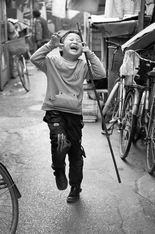 不论是谁,回忆中总有几个印象深刻的儿时玩伴吧。特别是在胡同里,那一个或者几个小淘气,常常是整个大院儿乃至整条胡同里的开心果、捣蛋鬼。淘气的孩子通常不会害羞,善于与人沟通,并且好奇心强,让人觉得活力十足。图中的小男孩,挥舞着一根竹竿在玩耍,见到陌生人准备给他拍照,于是蹦蹦跳跳、嬉皮笑脸地做了个鬼脸。这种善意的回应,既让人感到意外,又觉得十分可爱,俨然是个惹人喜欢的小淘气。