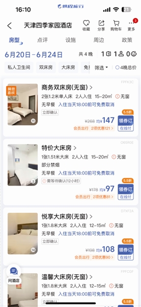 在海河中学参加高考的李同学告诉记者,由于考点离家较远,在查询到考点后的第一时间,他便在网上预订了7日和10日的钟点房。“7日和10日都是上下午两场考试,为保证中午能得到充分休息,所以预订了这两天的钟点房。”他展示着手机里的订房截图,其中,7日中午三个小时的豪华标间价格为184元,10日中午四个小时大床房价格为128元。