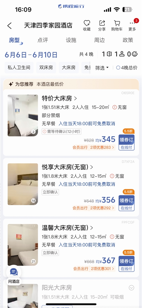 记者通过携程、美团等酒店预订平台调查发现,随着高考临近,天津市内各考点周边酒店都不同程度出现“客房告急”情况,房价也普遍上涨。记者以6月6日至10日高考期间的价格与6月中下旬非高峰时段(13日至17日、20日至24日)对比发现,部分酒店价格涨幅达到255%。