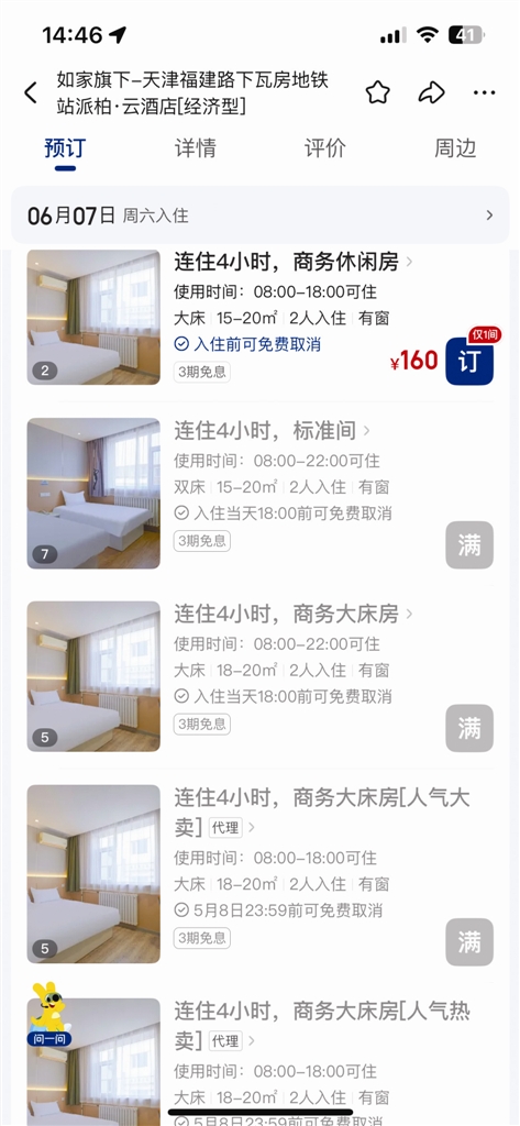 高考期间,为保证学生中午可以得到充分休息,不少学生和家长选择了供午间休息的钟点房。记者在携程、美团等平台搜索发现,河西区浦口道附近的璞晶唯庭酒店提供钟点房服务,其中高考期间的7日、8日、9日的钟点房全部满房。福建路上柏云酒店7日当天仅剩一间连住4小时的商务休闲房,连住4小时的标准间、商务大床房都已满房,8日和9日还有少量钟点房,10日也已满房。