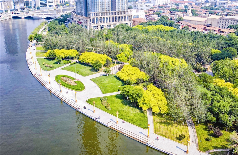 日前,作为海河沿岸大型广场,河北区海河中心广场公园提升改造完成,通过对堤岸石材更新改造,园林绿化提升等,为市民提供舒适的游园环境。记者 吴迪 摄