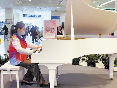上午10时许,在上海交通大学医学院附属瑞金医院门诊大厅,琴声悠扬悦耳。步履匆匆的患者与医护人潮中,几个亮眼的红色身影在忙碌。自助报告机旁、志愿者服务窗口处、三角钢琴前……她们在此拥有同一个名字——“广慈家园”志愿者。