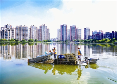 连日来,津城持续高温,湖泊河道内水生物进入生长旺盛期。西青区津门湖街道持续开展水草清理行动,对水草、藻类及水面垃圾进行细致清理,营造美丽湖景和良好生态环境。 记者 潘立峰 摄