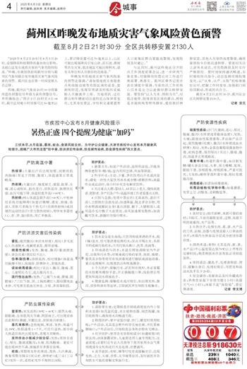 三伏未尽,8月高温、暴雨、蚊虫、食源风险交织。为守护公众健康,天津市疾控中心发布本月健康风险提示,提醒广大市民注意“防中暑、防洪涝后传染病、防虫媒传染病、防食源性疾病”四大要点。