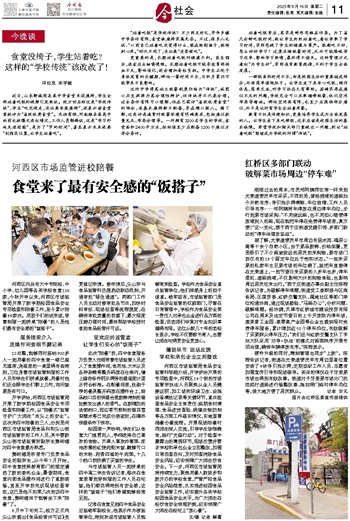河西区市场监管局食品安全监管科邹超介绍,开学伊始开展的专项检查中,河西区14个街的市场监管所执法人员聚焦从业人员健康证明、加工场所环境卫生、设施设备清洗记录等关键环节,重点检查食品安全主体责任、临期食材清理、食品进货查验、病媒生物防制等各方面工作落实情况,实地查看桶餐分餐流程。开展现场陪餐时同师生深入交流,引导学生珍惜粮食,践行“光盘行动”。对于检查中暴露出的薄弱环节,现场反馈并要求学校和承包企业立即整改,加强日常自查自纠,及时排查消除食品安全风险,切实保障广大师生饮食安全。下一步,河西区市场监管局将持续发力,聚焦用餐人数较多和新开办的学校食堂,严管严控食品安全风险隐患,扎实推进校园食品安全监管工作,切实提升各类学校校园食品安全水平,为广大师生在校饮食安全保驾护航,切实保障广大师生在校吃上“放心餐”。