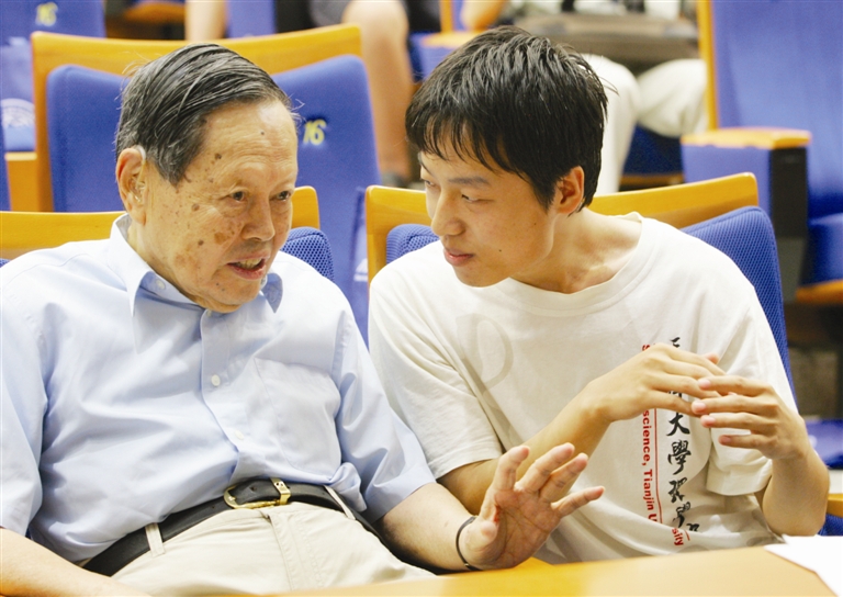 2011年6月18日,杨振宁先生在参加“理论物理前沿研讨会”时,与学生交谈。