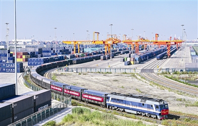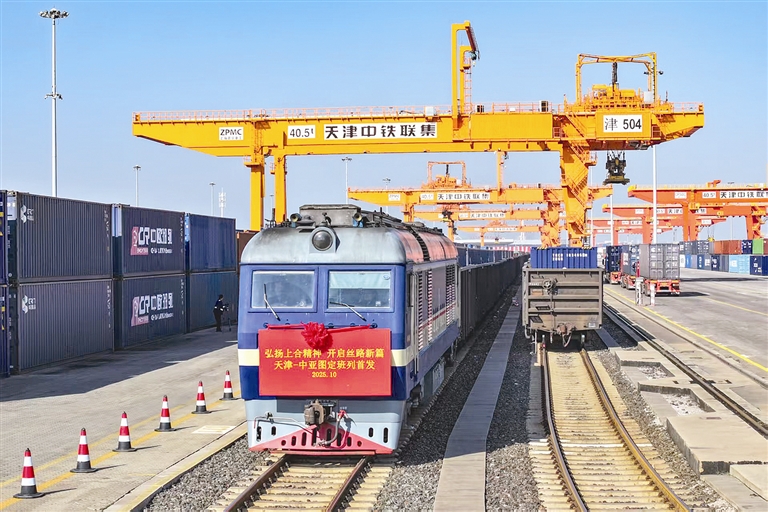 10月20日,在天津集装箱中心站,本月第二列天津霍尔果斯图定班列发出,向着新疆方向疾驰,天津港与中亚国家地区的国际货运联系愈加紧密,为我国北方地区与上合组织国家的经贸往来架起了一条稳定快捷的“钢铁丝路”。