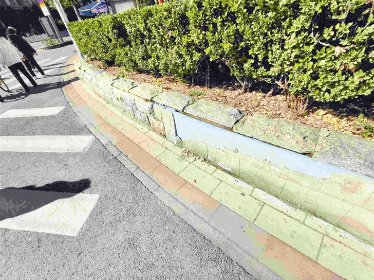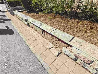 10月20日上午,记者来到北马路与金钟桥大街交口,在路口西北侧看到,便道上的花坛石材脱落后,里面填补的蓝色板子裸露在外。随后,记者沿金钟桥大街继续向北走看到,道路西侧近百米的路边花坛均有不同程度的损坏,最严重的地方有三四米石材完全脱落。即使有的区域进行过修复,但由于修复区域与原有材料不一致,只是用板子和水泥填补,经过风吹日晒后水泥开裂,板子与水泥之间也形成裂缝。