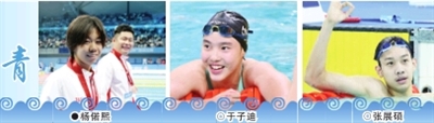 13岁的于子迪也不落下风,她在主项混合泳里获得两金,刷新了女子200米混合泳的亚洲纪录,还摘下了女子200米蝶泳的银牌。总结本届比赛时,于子迪给自己打出了“90分”。至于那10分,她表示“差在成绩和名次上”。值得一提的是,400米混合泳前三名都是“10后”,除冠军于子迪外,亚军常墨涵和季军柯雯曦也都只有14岁。还有获得女子200米仰泳铜牌的天津队的杨偌熙,同样是14岁,她们在尚未确定泳姿的年纪,就开始争金夺银了。