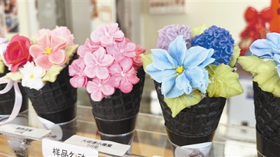一位海棠花冰激凌摊主介绍,今年有五六款新品,卖得最好的还是带海棠花和绣球花的这几款,“这几款颜色鲜艳,好出片儿。”