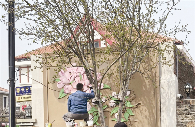 “每一处彩绘都是根据墙面的具体情况量身设计的,比如部分带有窗户的墙面,我们也结合窗型做了巧妙构思,让彩绘和原有建筑墙面融为一体。”谢文超坦言,项目刚开工两天,部分彩绘墙面紧邻海棠树,工作人员只能依托树木或者借助简易登高工具,握着一米长的毛笔打草稿,这也要求大家不仅要精通绘画技艺,还得熟练掌握登高爬梯的施工技能。他还提到,全部彩绘成稿后,还会做防水防晒专业处理,确保画作色彩鲜亮、留存持久,经得起风吹日晒。