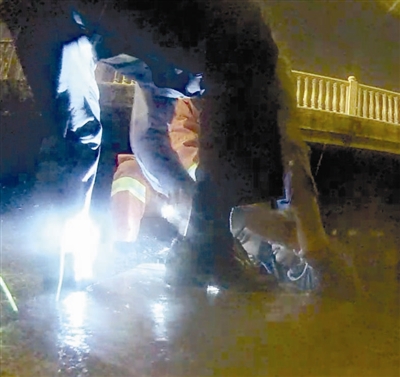 赶到北洋桥后,桥下寂静无人,只有一辆共享单车和旁边摆放的一双白色旅游鞋,这反常的一幕让民警心头一紧。“不好,人可能已经从这儿下水了!”两人迅速冲向河堤,借着手电光,果然发现一名女子在漆黑的河水中挣扎,身体正缓缓下沉,情况万分危急。