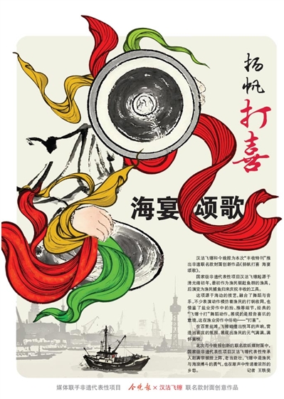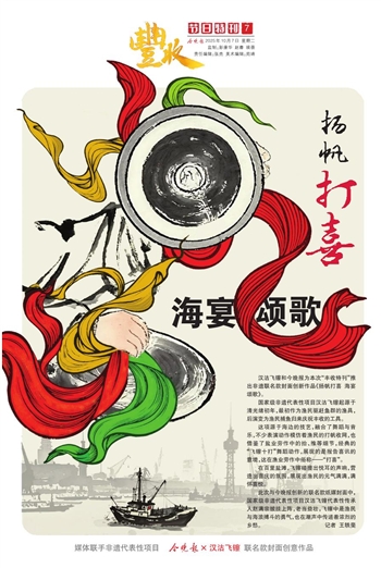 汉沽飞镲和今晚报为本次“丰收特刊”推出非遗联名款封面创新作品《扬帆打喜 海宴颂歌》。