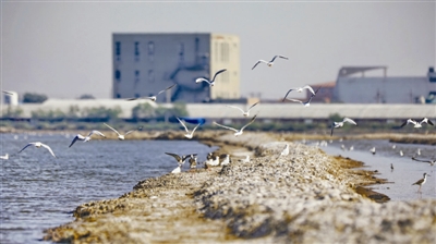汉沽盐场盐田形成了生产与生态、人与自然和谐共生的自然景观。