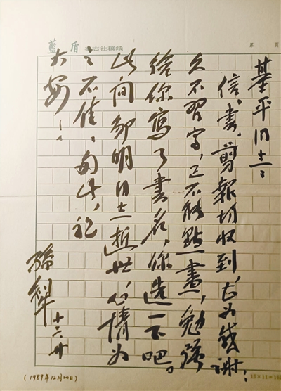 在1988年8月26日的信中,孙犁对自牧给他寄来1987年第6期《小说选刊》等表示感谢。之后,谈及三件事。一是听说他的创作学术研讨会将于10月召开。二是关于自牧请他题字的事。斋名,他身体好些时,试写一张。书名,因有时间要求,希望自牧找他人去写。三是近日因搬家劳累及不适应新的环境,他腹泻之疾复发,精神不佳。其中所说的《小说选刊》为《中国微型小说选刊》。此时,孙犁从多伦道216号大杂院迁至鞍山道学湖里16号楼新居。