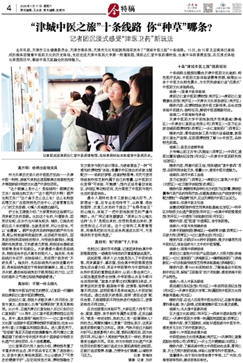 去年年底,天津市卫生健康委员会、天津市商务局、天津市文化和旅游局指导发布了“津城中医之旅”十条线路。15日,由15家主流媒体记者组成的媒体团循着中医药文化的历史脉络,先后走进天津中医药大学第一附属医院、津药达仁堂中医药博物馆、合真中华药香展览馆,在沉浸式体验与深度探访中,解锁中医文旅融合的独特魅力。