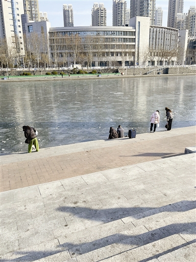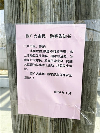 不远处,冬泳爱好者正用木桩敲开岸边冰层,准备冬泳。危险警示似乎被热闹的气氛稀释了。一位老人叹气说:“年年提醒,年年有人来。”