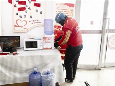 前天中午11时30分,记者来到时代奥城工会驿站,这个面积不大的空间里,冰箱、饮水机、应急药箱、充电器和工具箱等物品有序摆放,为过往户外劳动者提供便利。