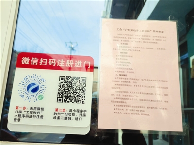 当记者想进入这家驿站时,却发现该驿站一侧的大门被一串金属铁链和一把大锁牢牢锁住。在被锁住的门上有一个塑料材质的标识,标识上印有“微信扫码注册进门”,其旁边又贴着一张粉色A4塑封卡片,上面写着“工会‘户外劳动者工会驿站’管理制度”,制度中明确了“服务对象、服务项目、服务范围”,其中“服务范围”第6条写明“开放时间,周一至周日9:00—17:00”同时还有一个“联系人刘老师”的座机电话。