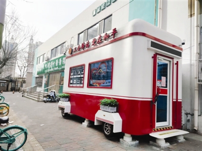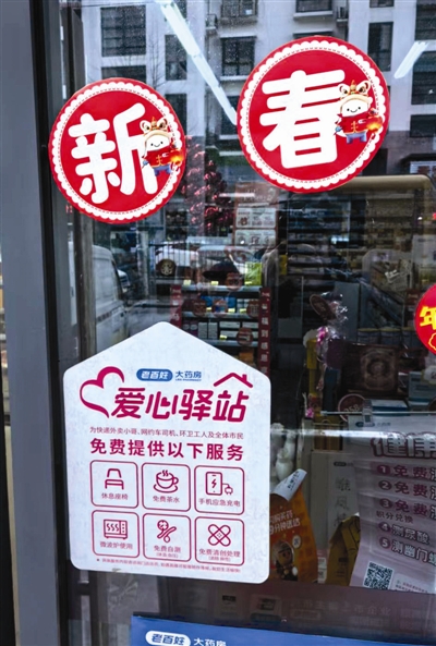 西青区中北镇甜水街商业街上,这里有一家设置在“老百姓大药房”的爱心驿站。大门口旁边的橱窗上,标有“爱心驿站”的不干胶贴纸十分醒目,上面标注的服务对象不仅有“为外卖小哥、网约车司机、环卫工人”,还有“全体市民”。上面显示免费提供的服务不仅有休息座椅、茶水、手机应急充电,还有微波炉使用,自测体温、血压和清创处理。