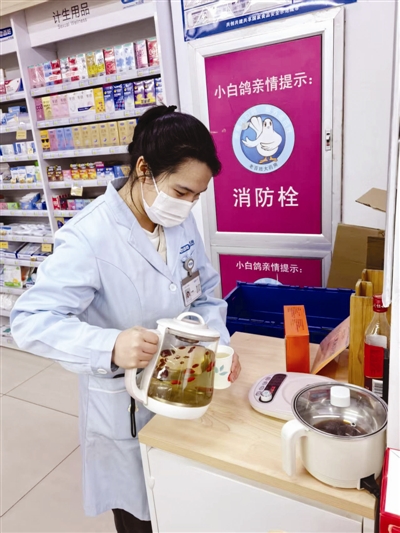 记者从两名店员口中得知,从爱心驿站开设以来,她们一直都在这里服务。此前到这里来寻求帮助的主要是一些外卖小哥和环卫工人。考虑到这几天的低温天气,她们特意在店内煮了一些养生茶。有顾客到店里购物挑选药品时,她们也会主动询问是否需要喝点热水。