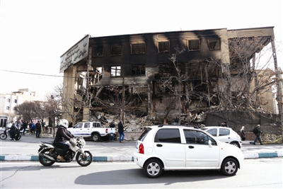 1月21日,伊朗伊斯兰共和国广播电视台援引伊朗国家安全委员会声明报道,伊朗近期发生的骚乱事件共导致3117人死亡,其中2427人是民众和执法人员。伊朗国家安全委员会的这份声明说,本月8日、9日,伊朗部分地区发生多起“恐怖”活动。“恐怖分子”实施类似极端组织“伊斯兰国”的“恐怖”行为,并广泛使用枪支。图为伊朗首都德黑兰,车辆经过在近期骚乱中受损的一处税务局建筑。