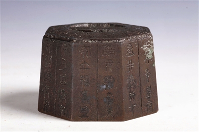 天津博物馆馆藏秦代旬邑权,高6.5厘米,口径8.3厘米,底径9.5厘米,是秦始皇统一全国衡制颁发的标准衡器。八角棱体,正视截面呈梯形,中空,器顶口有一长方形横梁。横梁左右两侧有阳文篆书“旬邑”(地名,在陕西省),权体八面有秦始皇和秦二世的诏书。诏书书体为小篆,古朴劲健。两诏铭文在秦权中较少见。